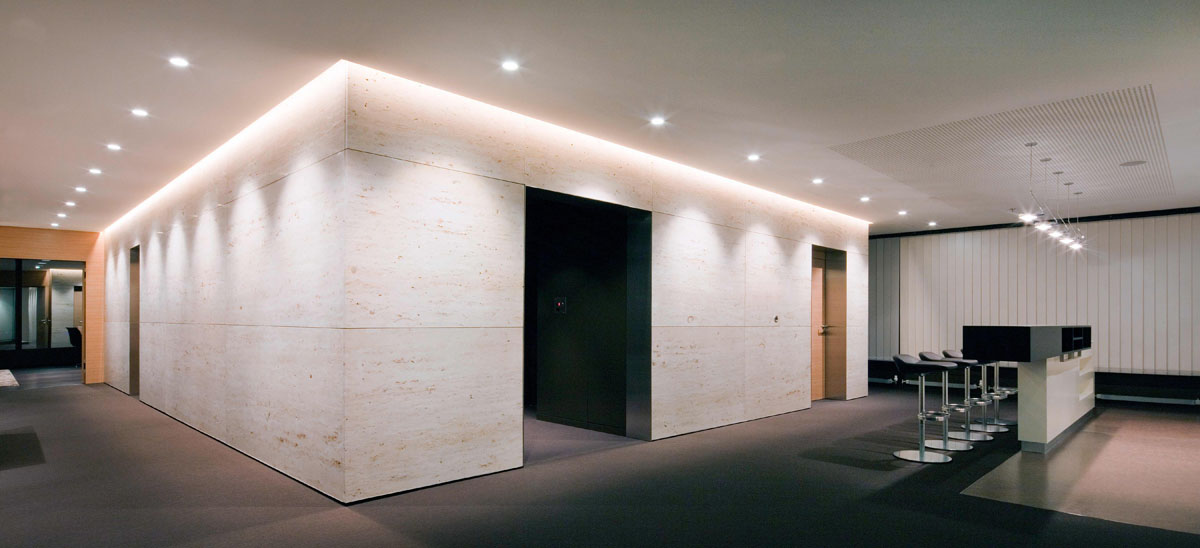 Die Ausführung erfolgte als Natursteinverkleidung mit Hinterschnittverankerung. Die Plattengröße beträgt stattliche 120 x 180 cm. Hierfür konstruierten wir eigens spezielle Montagehilfen.