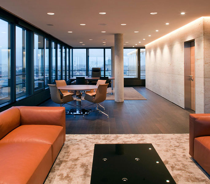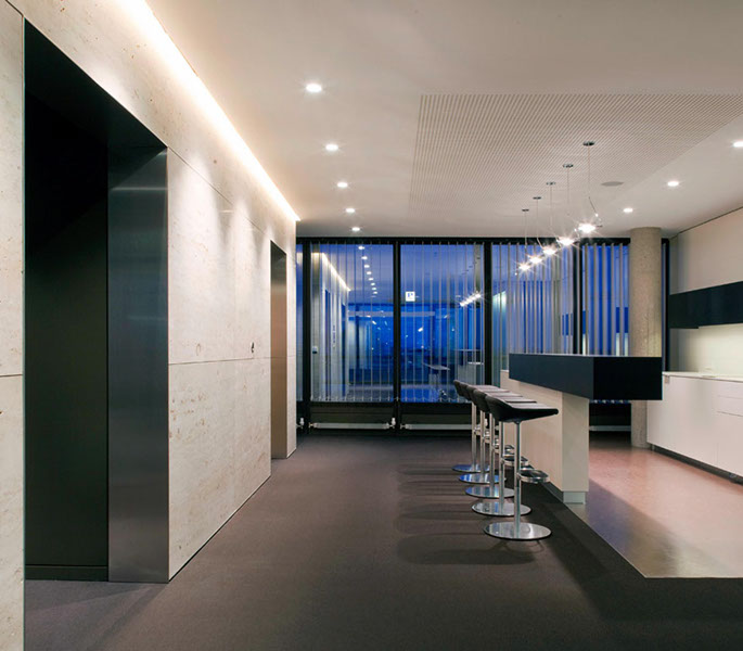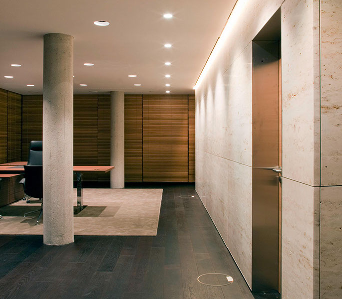 Die Ausführung erfolgte als Natursteinverkleidung mit Hinterschnittverankerung. Die Plattengröße beträgt stattliche 120 x 180 cm. Hierfür konstruierten wir eigens spezielle Montagehilfen.