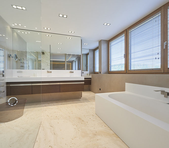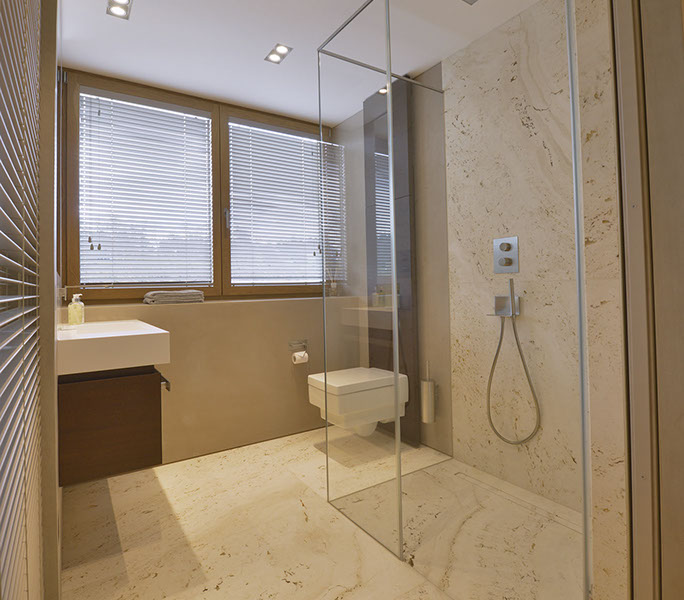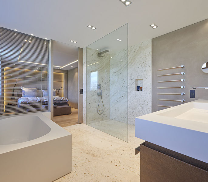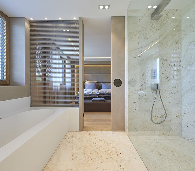 Das Penthouse in Freudenstadt wurde mit großformatigen Natursteinplatten, dessen Maserung durchlaufend gestaltet wurde, ausgestattet. Die Natursteinfugen wurden händisch gespachtelt und anschließend plan überschliffen, sodass der Eindruck entsteht, als ob es sich um eine ganze Natursteinrohplatte handelt. Ebenso entstand im Küchen- und Wohnbereich in Zusammenarbeit mit dem Schreiner eine massiv verkleidete Kamin- und Küchenarbeitsplatte mit entsprechender Unterkonstruktion.