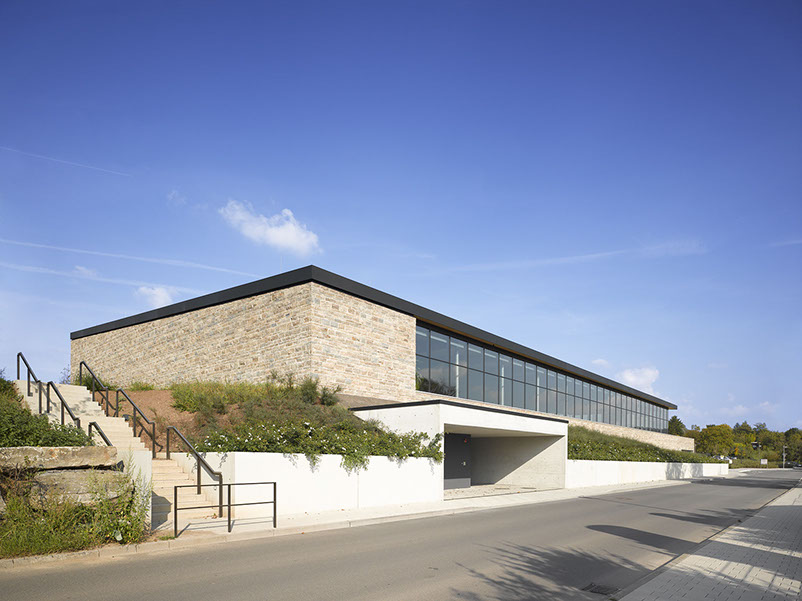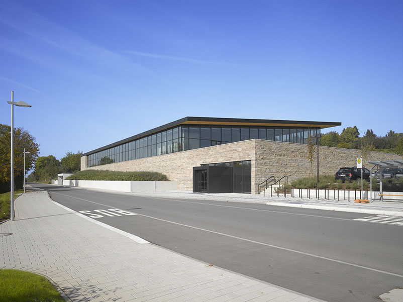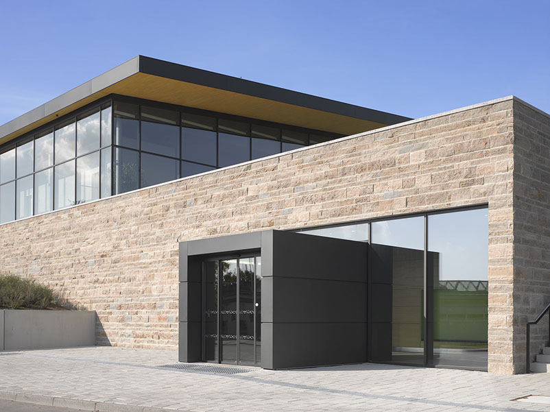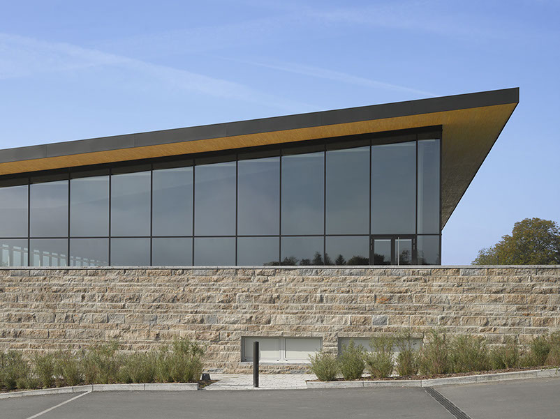 Die Innen- und Aussenverkleidung des Massivbaus trug den besonderen Anforderungen an Schwimmhallen gezielt Rechnung. Die Naturstein-Verankerung erfolgte mittels Vormauerschale mit Auflagerkonsolen. Ihre Steinstärken betragen ca. 10,0 cm.